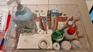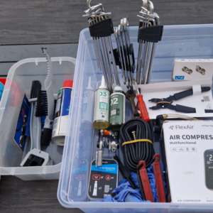 - Vous trouverez également du matériel et outils de réparation de vélo et une trousse des premiers secours.